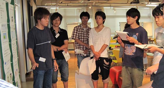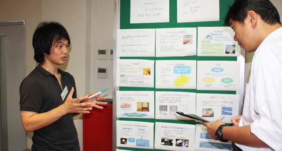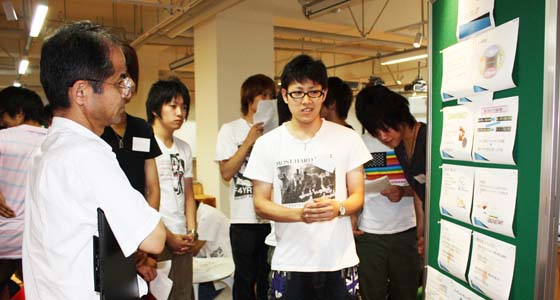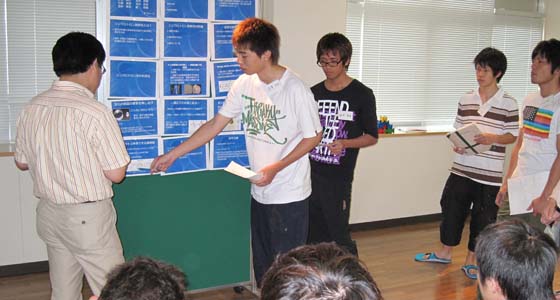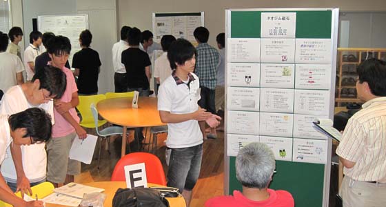 平成22年7月22日、総合システム工学科1年生による、総合システム工学科入門PBLグループ発表会が行われました。1年生にとっては初めてのプレゼンテーションになります。グループごとに作成したポスターを掲示して説明を行いますが、始めは緊張の面持ちでの発表も回を重ねるにつれ質問にも丁寧に対応できるようになりました。