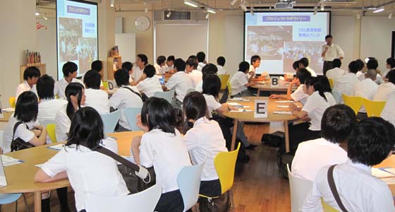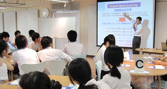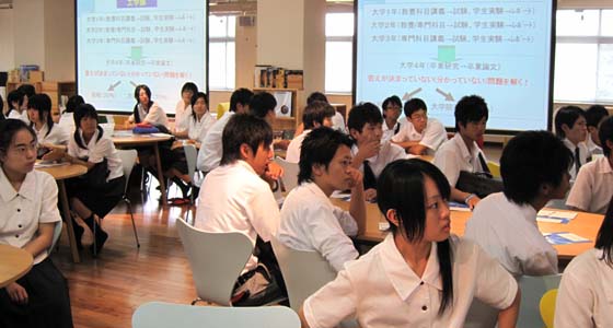 平成22年7月29日、筑紫中央高等学校2年生の皆さんが来校しました。前半61名・後半60名に分かれ、来年の進路決定に向けてスクリーンやパンフレットを見ながら熱心に学科の説明を聞いていました。従来の国立大学にはないラボラトリの雰囲気は男女ともに学生には大変好評でした。