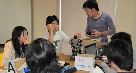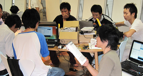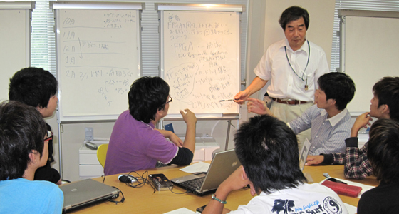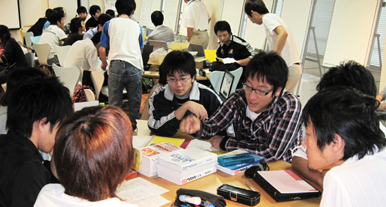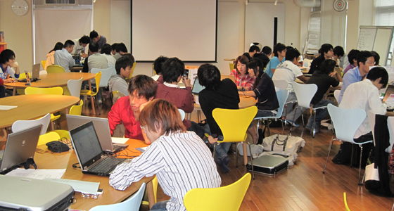 平成22年度後期総合システム工学PBLの授業がスタートしました。3年生にとってはPBL科目の総決算となるプロジェクト活動です。5~7名で編成されたチームごとに、実施計画の立案からプロジェクトの実行まで全て自分たちで行います。平成23年2月1日、北九州国際会議場で行われる成果発表会に向け、熱のこもった意見交換が行われていました。