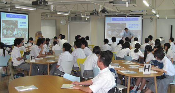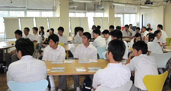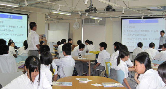 平成23年7月12日、福岡市立西陵高等学校から2年生42名の皆さんが出前講義受講のため来校しました。今回は「携帯電話もゲームもパソコンも自動車も集積回路(IC)がぎっしり-ICってなに?半導体ってなに?-」というテーマで、総合システム工学科中尾准教授による講義が行われました。早朝からの移動にも拘わらず、実際にICやシリコンウェハーを手にしたり、映画のストーリーをからめた物理の講義など、興味深い授業に皆熱心に耳を傾けていました。講義終了後は生徒代表による感想・謝辞が述べられ、退室時には室内のソファや椅子でくつろぐ光景も見られました。