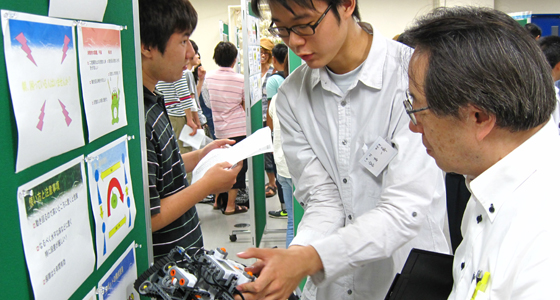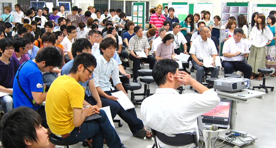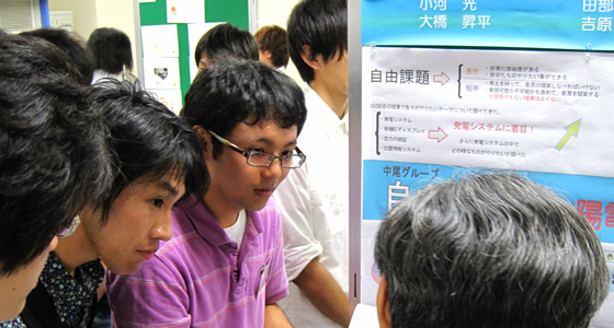 平成23年7月28日、PBL合同成果発表会が行われました。従来学年毎に実施していた成果発表会を、今年度初の試みとして合同で行いました。ラボラトリで各チームとも入念にリハーサルを行った後、場所を理数教育支援センターに移して本番に臨みました。始めに1分間のショートプレゼンテーションで各チームの取組紹介を行った後、ポスタープレゼンテーションを行い、どのパネルでも活発な質疑応答が見受けられました。