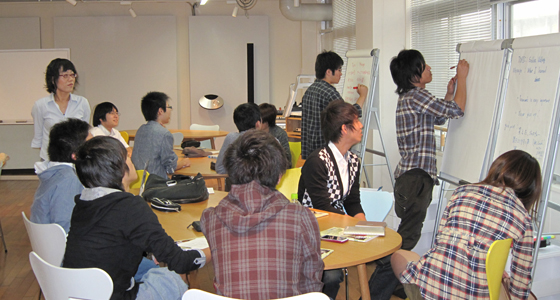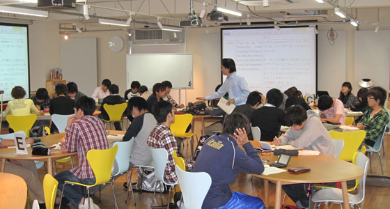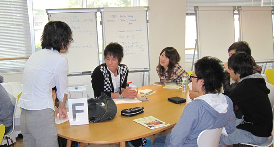 平成23年度後期人間科学・総合英語の授業がスタートしました。授業では3面スクリーンやフリップチャートなどプロジェクトラボラトリの設備を活用し、総合英語Cではグループに分かれて、TOPICとMESSAGEのキーワードを挙げながらディスカッションが行われました。その後グループごとに発表を行い、開放的な雰囲気の中、質疑応答も活発に行われました。