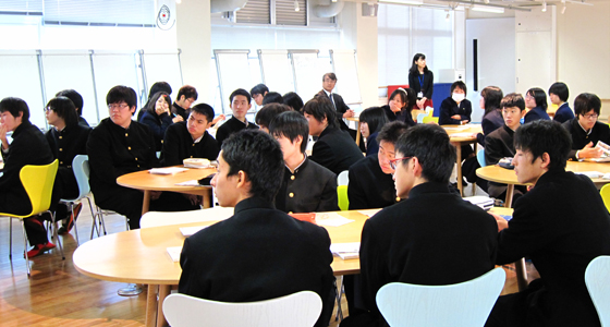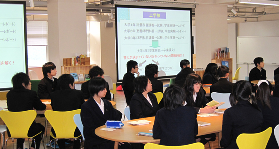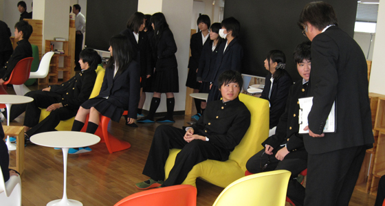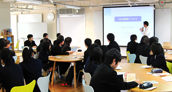 平成23年10月31日、山口県立下関西高等学校から2年生39名の皆さんが来校しました。初めて目にする大学の講義室とは思えないプロジェクトラボラトリの雰囲気に女子生徒から思わず歓声が上がりました。また、こちらも初めて耳にするPBL教育プログラムの説明では、これから大学生に求められるコミュニケーション能力の必要性について全員熱心に耳を傾けていました。