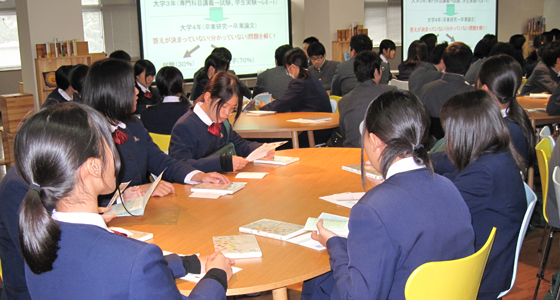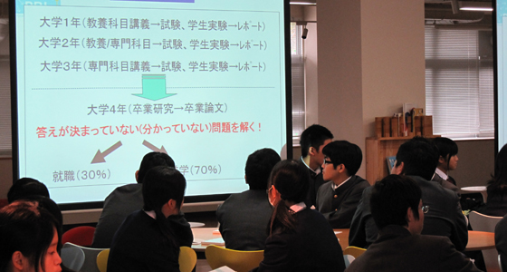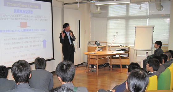 平成23年11月10日、福岡県立小郡高等学校から2年生90名の皆さんが来校しました。通常は開放感あふれるスペースのプロジェクトラボラトリですが、この日は後方まで満員となり、サブスクリーンもフル活用しての説明となりました。PBL教育プログラムの説明では、データをもとに大学生に求められる主体性やコミュニケーション能力の重要性についての解説が始まると、熱心に耳を傾け今後の進路について参考にしている様子がうかがえました。