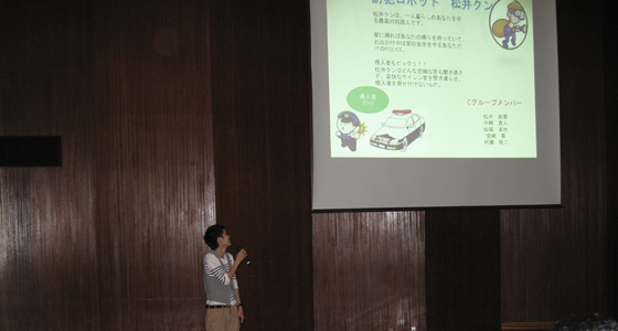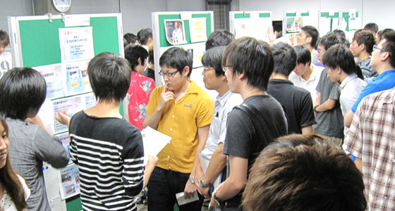 平成24年7月19日、総合システム工学科PBL成果発表会が行われました。ラボラトリで各チームとも入念にリハーサルを行った後、第一部は記念講堂でのショートプレゼンテーション、第二部は鳳龍会館にてポスタープレゼンテーションを行いました。1年生から3年生まで合同での発表形式は、昨年に引き続き二度目となります。また、今回、ポスタープレゼンテーションでは来場者にシールを配布し、「プレゼン」「工夫」「結果」の評価項目について良かったチームにシールを貼っていただき、総合点を競う審査形式を取り入れました。どのチームも活発に取組み内容についてのプレゼンを行った結果、1位から3位のチームに前田工学部長から表彰状が手渡されました。