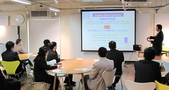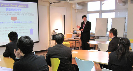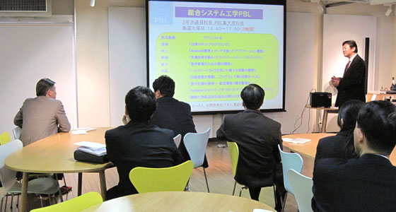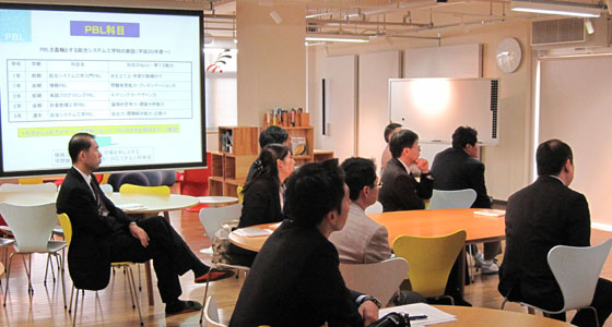 平成24年11月22日、福岡県高等学校北九州筑豊地区化学部会から9名の先生方が来校しました。中尾PBL教育推進室長より、本学でのPBL教育プログラムの取り組みや、データを交えた就職についての説明に、皆さん熱心に聞き入っておられました。また、通常の形態とは異なるPBL科目について、具体的な評価方法などの活発な質疑応答が行われ、PBL教育プログラムに対する関心の高さが伺われました。