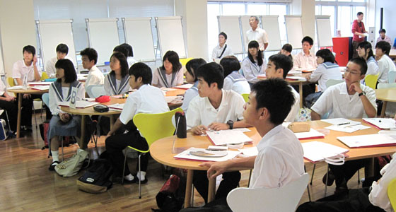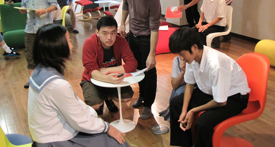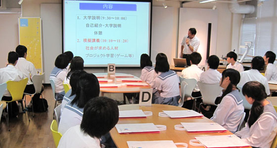 平成25年10月11日、大分県立大分舞鶴高等学校から1年生24名の皆さんが来校しプロジェクトラボラトリで模擬授業を受講しました。中尾PBL教育推進室室長から大学説明を受けた後、グループ対抗でコミュニケーションゲームを行いました。伝言ゲームの要領である図形を口頭のみで伝達していくゲームに、どのチームも苦戦気味でした。引き続き「将来開発できたらよいと思う商品」という題でグループディスカッションが行われ、代表者による商品についての紹介がありました。各チームともユニークでアイデアに富んだ商品が発表され、説明を聞いた後は、各自が良い商品と思うものに評価シールを貼って、順位を競いました。先のコミュニケーションゲームと併せた合計点で優勝チームが表彰され、最後は生徒代表者による挨拶がありました。最初は緊張気味にスタートしましたが、時間のたつのも忘れるほど活気溢れる授業となりました。