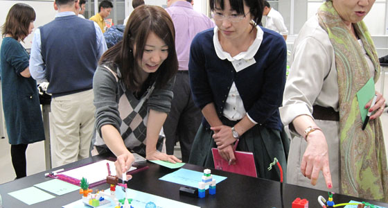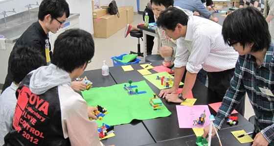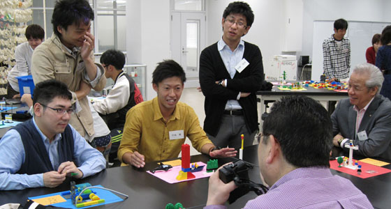 平成25年10月17日、「レゴシリアスプレイ」ワークショップを開催しました。株式会社ロバート・ラスムセン・アンド・アソシエイツ代表取締役社長蓮沼孝氏をファシリテーターに迎え、教職員・学生25名が5つのグループに分かれて参加しました。レゴを通して発表や質疑応答を行うなど、これまで体験したことのないグループワークとなりました。「考えてから創る」のではなく、創作する過程で自分の意志やアイデアか整理され、レゴで表現されるというユニークな手法で、プロジェクト活動や就職活動時の研修など、色々な場面で活用できるとの声が聞かれました。また、4時間にわたるワークショップでしたが、参加者からは時間が足りないほどあっという間に修了したとの感想も聞かれ、アンケートには次回開催を希望する意見も多く寄せられました。