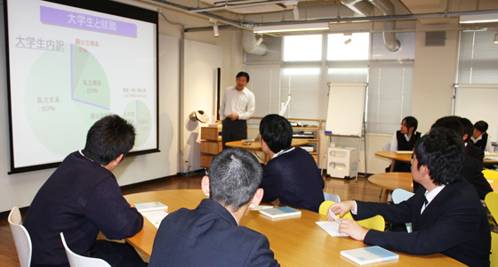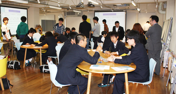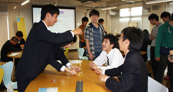 平成26年5月8日、福岡県公立古賀竟成館高等学校から2年生36名の皆さんが来校しました。中尾PBL教育推進室長によるPBL教育プログラムについての説明を受けた後、グループに分かれマシュマロチャレンジを行いました。限られた材料を使って作成したタワーの高さを競うもので、何度も試行錯誤しながら作る班、設計に時間をかける班などグループ毎に特色が現れていました。この実習の意図は、大学で行うプロジェクト活動にも通じており、楽しい雰囲気の中、皆さん真剣に取り組んでいました。