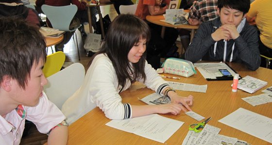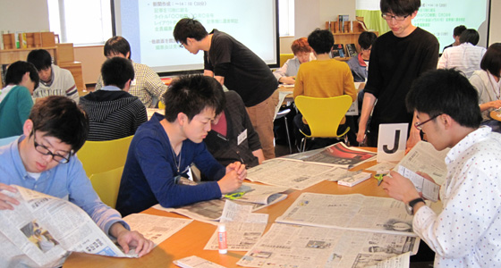 平成26年度総合システム工学入門PBL授業の一環としてPlay in Newspaperを行いました。新聞をコミュニケーションのツールとして使い、オリジナルの新聞をグループで作る「回し読み新聞」と呼ばれる手法を今年度入門PBLに導入しました。各自気になる記事を3つピックアップし、選んだ理由をプレゼンすることで、同じ記事でも異なる視点があること、さらに新聞作成のため記事を絞りこむ段階でディスカッションを重ねる等、対面型のコミュニケーションスキルの向上に繋がるものです。出来上がった新聞は全員で閲覧し、活発な質疑応答が行われました。