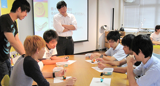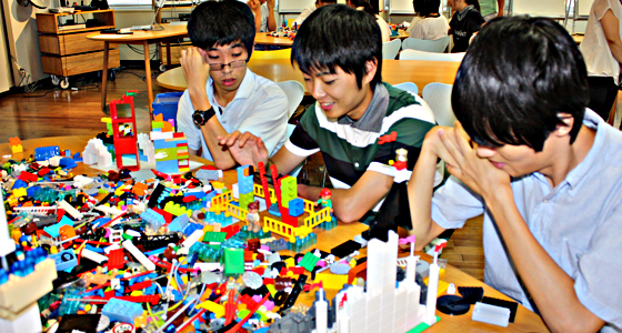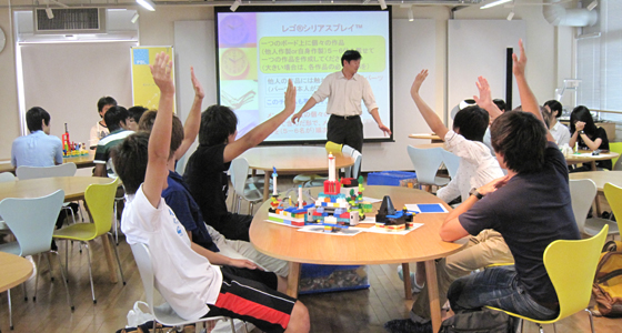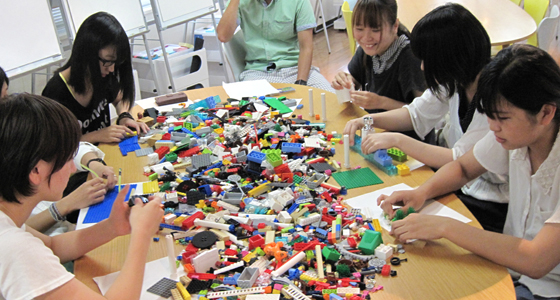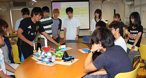 平成26年度前期物理学Ⅰの授業の一環として8月11日にレゴシリアスプレイを実施しました。参加者は3つのグループに分かれ、まず制限時間内で数が限られたパーツを使っての作品製作から始まり、その後はあるテーマに沿って、各自テーブルに広げられたレゴの山から自由にパーツを選び、作品を製作しました。作者は、自分の作品について、製作意図やイメージをグループメンバーに向けてプレゼンテーションを行い、最終的にはメンバー全員の作品を合体させてストーリーを共有するという作業を行いました。ユニークな発想から、どのグループも特徴のある造形物が完成し、またレゴを通して自己を表現するという手法に参加した学生は熱心に取り組んでいました。