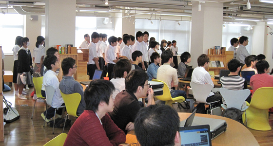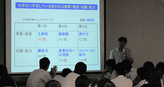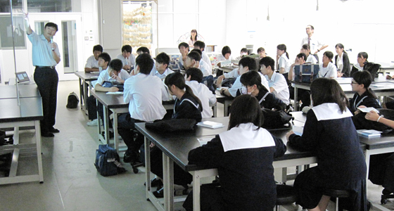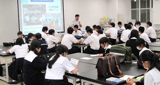 平成26年10月3日、折尾愛真高等学校から1・2年生37名の皆さんが来校しました。プロジェクトラボラトリでは「電気電子工学PBL実験」の授業が行われており、通常の教室とは異なる空間で実際に学生が受けている講義をライブで見学できるとあって、短い時間でしたが皆さん熱心に見入っていました。その後サイエンス工房へ場所を移し、中尾PBL教育推進室長によるPBL教育プログラムについての説明を受けました。大学受験は少し先になりますが、九工大で取り組んでいる特色あるPBLカリキュラムの説明を聞き、質問も出るなど本学への関心の高さが伺えた見学会でした。
