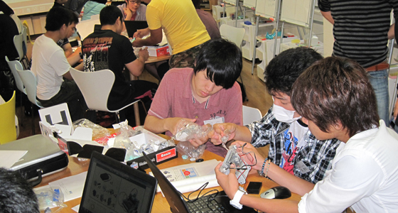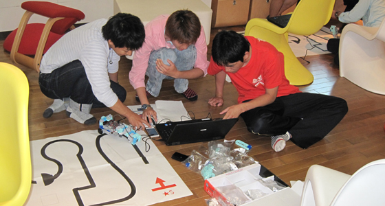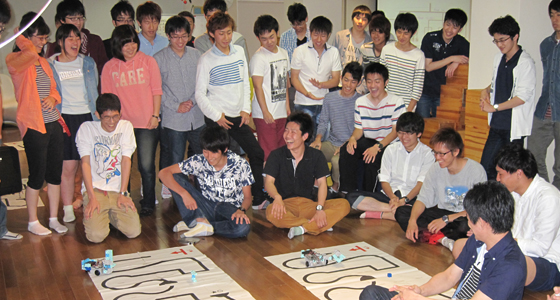 平成27年度総合システム工学入門PBL授業の一環としてブロックロボット製作を行いました。プログラミングの専門知識がなくてもノートPCを使用してブロックで作ったロボットを動作させることができるシステムで、今年度初めて入門PBLで導入しました。2年次の授業「実践プログラミングPBL」で行うロボカー同様、ライントレース上を走行させ、途中に設置したブロックをゴールまで運ぶという課題も盛り込んだプログラムを組みました。どのチームも授業時間外に自主的にプロジェクトラボラトリで遅くまで作業する姿が見られ、最終日には18チームによる白熱したタイムトライアルレースが行われました。
