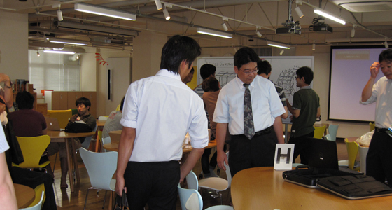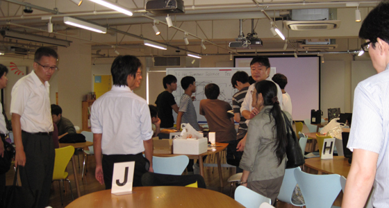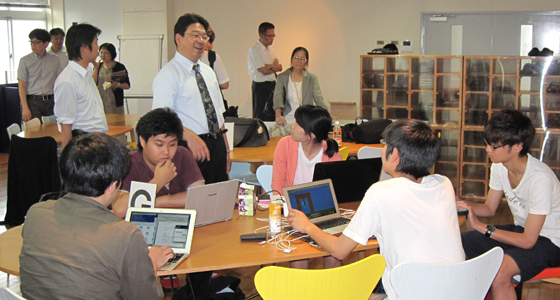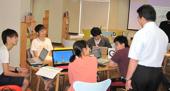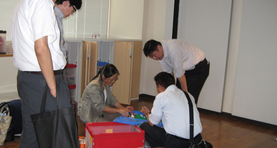 平成27年7月14日、北九州工業高等専門学校より8名の教職員の方々がPBL関係の施設および授業見学のため、本学戸畑キャンパスに来校されました。アクティブラーニングの推進は本学でも積極的に行われており、中尾PBL教育推進室長より、見学日当日行われていた総合システム工学科必須科目「入門PBL」「総合システム工学PBL」の概要や、PBL専用スペースとして設計されたプロジェクトラボラトリのコンセプトについて説明が行われました。その後、来校された先生方からは、実際にプロジェクト活動をしている学生に声をかけられたり、チームビルディング演習のための教材(ブロックロボット、レゴシリアスプレイ用ブロック)の運用や効果について熱心に質問される姿も見られました。