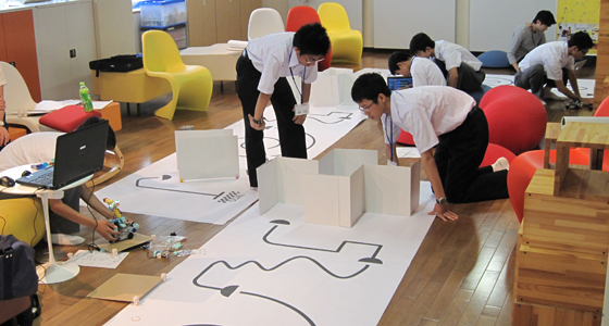 平成28年6月12日、高校版RoboSTEAM’16 in北九州が開催され、福岡県立小倉高等学校および戸畑高等学校の化学部に所属する1~3年生が参加しました。ノートPCのアイコンを使ってプログラムを組み、ブロックで作ったロボカーを走行させるものです。ライントレース上の幾つかの課題をクリアしながらタイムも併せて競うスタイルで、本学の総合システム工学科必須科目「入門PBL」でも導入されています。二人一組の両校混成のチームですが、初対面ながらどのチームも熱心に意見交換を行い、試行錯誤しながらプログラミングを改良するなど、真剣に取り組む姿が見られました。第1回目となる本コンテストは来年度も開催を予定しており、より多くの高校生の方が参加できるよう広くアナウンスを行う予定です。