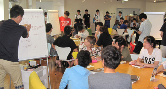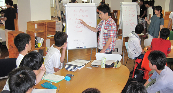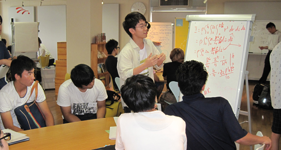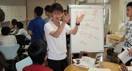 平成28年度前期物理学Ⅰ(建設社会工学科1年)の授業が、グループ学習の形式で行われました。講義を聞き各自で問題に取り組む授業形態が一般的な物理ですが、今回8~9名からなるグループで課題に取り組むアクティブラーニングのスタイルで実施されました。前半は、様々な剛体形状(円柱、円筒、球、球殻、円錐、円錐台、四角錐)に対し、回転軸に関する慣性モーメントの計算を各班ごと意見を出し合いながらフリップチャートに記述し、後半は班員全員が他班のメンバーに自分たちの解析について説明を行う構成で、どのグループでも解説に熱心に聞き入る姿が見られました。今回の試みは、難解な問題にグループで取り組むことにより新たな知見が得られ、他者に説明することで理解度を深める画期的なプログラムとなりました。