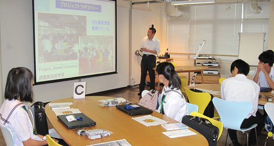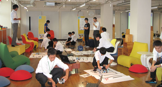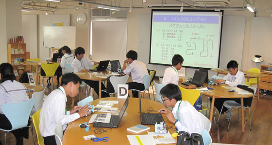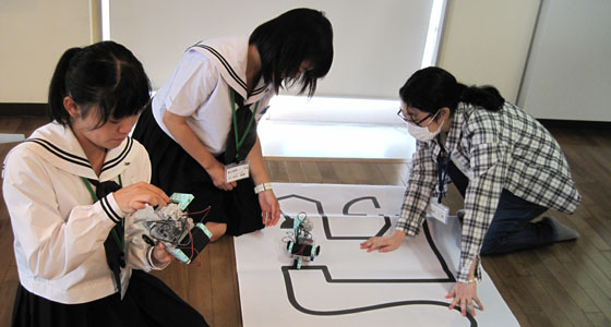 平成28年9月13日、山口県立徳山高等学校SSHの体験学習がプロジェクトラボラトリで行われました。2年生14名が参加しました。テキストを参考に、TAのアドバイスを受けながら、ブロックロボットの製作を体験していただきました。PCを用いてプログラミングを行った後、ロボットカーを走行させ、完成後はライントレースによる14人対抗コンテストが行われました。ライントレース上、まず、第一関門通過、第二関門通過、ゴールに挑戦し、最後に、タイムトライアルにも挑戦しました。試行錯誤しながらプログラミングを改良する等、真剣に取り組む姿が見られました。