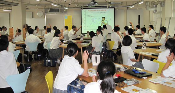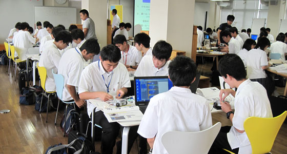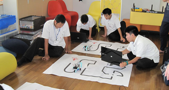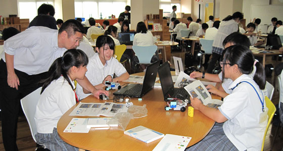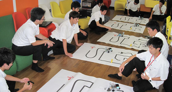 平成28年9月16日、筑紫台高等学校の模擬授業がプロジェクトラボラトリで行われました。2年生57名が参加しました。中尾PBL教育推進室長より、PBL教育についての説明が行われた後、テキストに沿って、プログラミングの製作を体験していただきました。二人一組で、PCを用いてプログラミングを行った後、ロボットカーを走行させ、完成後はライントレースによるチーム対抗コンテストが行われました。ライントレースでは、いくつかの関門クリアに挑戦し、最後にタイムを競い合いました。限られた時間でしたが、TAのアドバイスを受けながら、熱心に取り組みました。