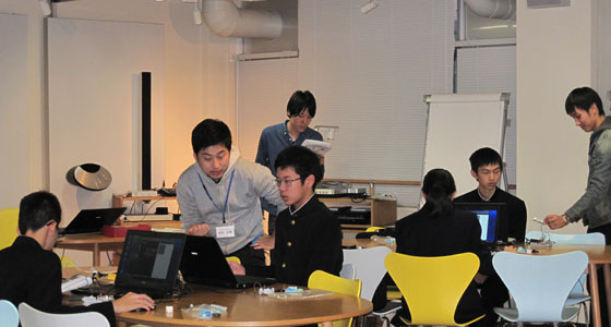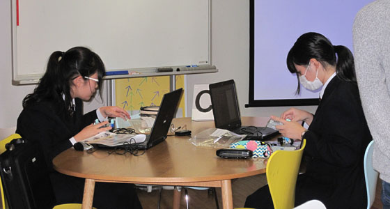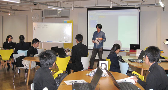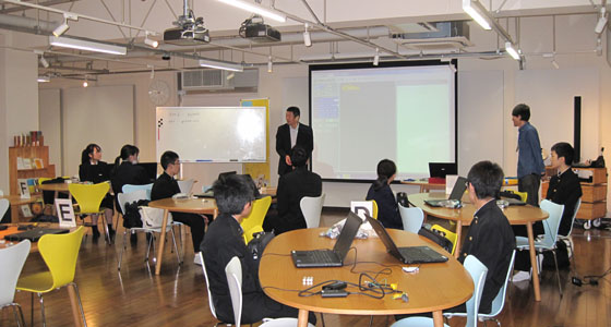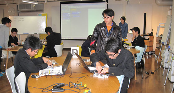 平成28年11月4日、総務省プログラミング教育の実証校、福岡県立戸畑高等学校の学生への教育(1回目)が、プロジェクトラボラトリで行われました。福岡県立東筑高等学校の学生も参加しました。PCのアイコン(スクラッチ)等でプログラミングを行い、ブロックで作ったロボットを動作させるというものです。学生メンターが5回の教育を実施します。2回目は11月11日、12月は、2日・9日・16日、プロジェクトラボラトリにて行われます。