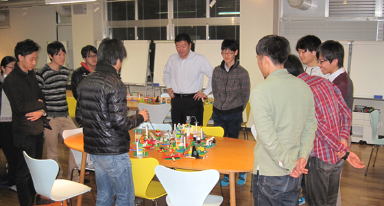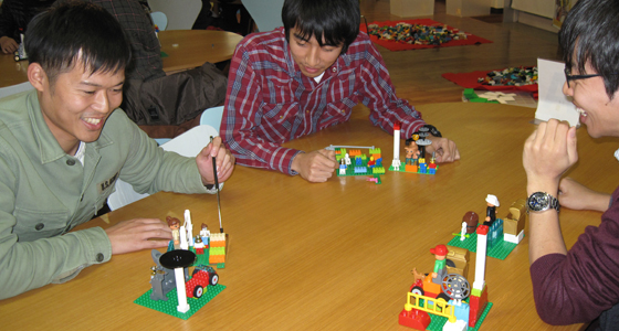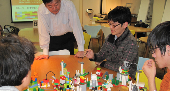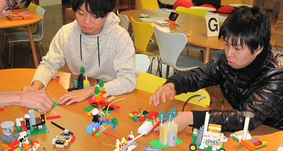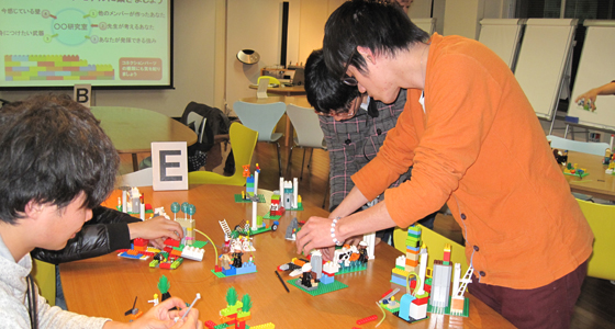 平成28年度半導体薄膜電子デバイス特論授業の一環として、レゴ®シリアスプレイ®を行いました。総合システム工学科1年生必須科目「入門PBL」にも導入されているメソッドを大学院生を対象に、各自が所属する研究室と自分の関係性をイメージする目的で実施しました。所属研究室毎に3~4名で一つのテーブルにつき「他者から見た自分像」「自分の強み」など個人モデルをブロックで制作し、互いに作品を通して語り、質問し合う形式で進められました。後半は自身が持つ研究室のイメージをメンバーで共有し研究室モデルを作成しました。その後、先の自分を表わす5つの個人モデルをコネクションパーツを使って研究室作品と繋ぎ合わせ、自身と研究室の関係性をより具体的にすることで、これまで漠然と持っていた様々なイメージが鮮明になり、新たな気付きや発見を得る結果となりました。