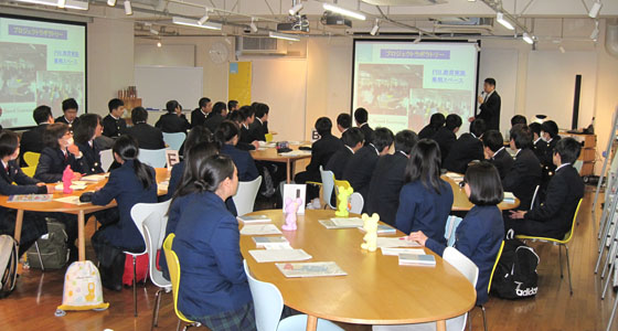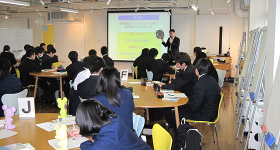 平成29年1月27日、熊本県立東陵高等学校から1年生40名の皆さんが来校し、プロジェクトラボラトリで模擬授業を受講しました。中尾PBL教育推進室長の自己紹介があり、大学説明を受けた後、模擬授業「スマホもゲームもパソコンも自動車も集積回路(IC)がぎっしり」が行われました。タイムマシーン(アインシュタインの相対性理論)について、最後に大学生活について、講義が行われ、皆さん熱心に耳を傾けていました。