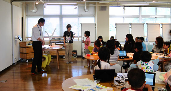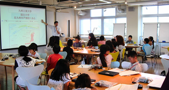 平成29年8月23日、北九州市立泉台市民センターの模擬授業が、プロジェクトラボラトリにて行われました。小学生42名とその保護者、スタッフの方が来場されました。2人1組になってブロックでロボカーを組み立て、ノートPCでプログラムを行い、走行させました。保護者の方と一緒にロボカー作りを楽しむ姿も見られました。夏休みの楽しい学びとなったようです。
