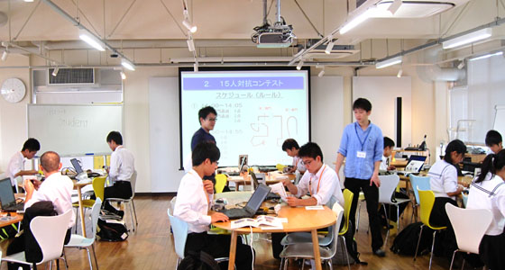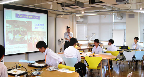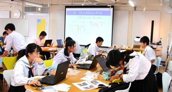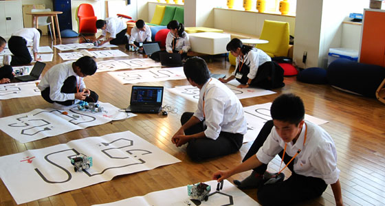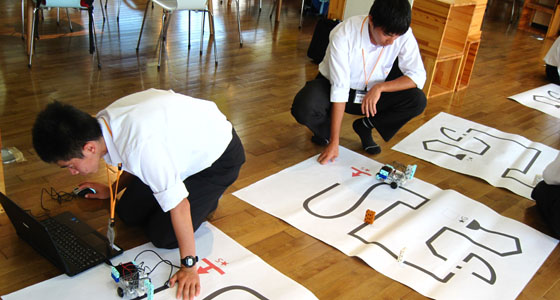 平成29年9月12日、山口県立徳山高等学校SSHの体験学習がプロジェクトラボラトリで行われました。2年生15名が参加しました。中尾PBL教育推進室長より、PBL教育についての説明が行われた後「プログラミングによる論理思考」のテーマで、ブロックロボット製作を行いました。PCを用いてプログラミングを行った後、ロボットカーを走行させ、完成後はライントレースによる15人対抗コンテストが行われました。ライントレース上、まず、第一関門通過、第二関門通過、ゴールに挑戦し、最後に、障害物タイムトライアルレースを行いました。試行錯誤しながらプログラミングを改良する等、真剣に取り組む姿が見られました。