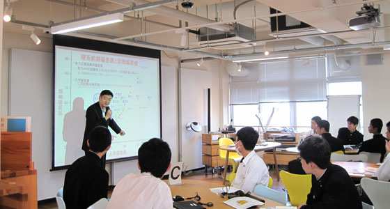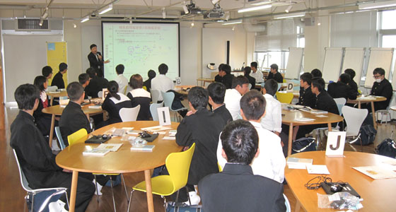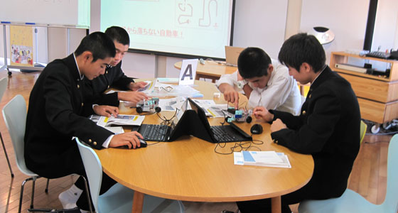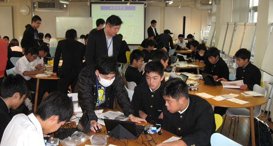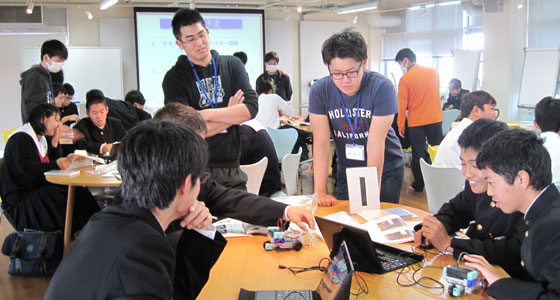 平成29年10月24日、福岡県立新宮高等学校の模擬授業がプロジェクトラボラトリで行われました。1年生40名が参加しました。中尾PBL教育推進室長より、PBL教育についての説明が行われた後、テキストに沿って、ブロックロボットの製作をしていただきました。二人一組で、PCを用いて、ロボットカー走行、衝突回避までのプログラム作成を体験していただきました。60分という短い時間でしたが、どのチームも熱心に取り組んでいました。
