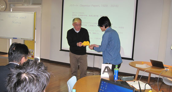 平成29年11月12日、㈱ロバート・ラスムセン・アンド・アソシエイツ ラスムセンアカデミー校長 石原正雄氏による、コンストラクショニズム特別講演会が行われました。教職員と学生(全9名)が参加しました。コンストラクショニズムは、MIT の研究者シーモア・パパートが提唱した知識獲得と学びに関する理論です。コンストラクショニズムに沿った学びとは どのようなものか、実際にパパート教授が紹介した事例に沿ったプログラミング演習を行いました。とても有益な講演会となりました。