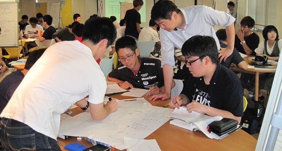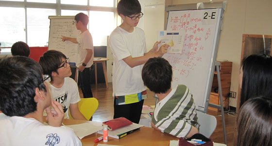平成30年度前期物理学Ⅰ(電気電子工学科1年)の授業をグループ学習の形式で行いました。今回5名のグループで課題に取り組むアクティブラーニングのスタイルで実施されました。前半は、各班ごとに慣性モーメントの計算をして、意見を出し合いながら、フリップチャートに回答を書き、後半は全員が他班のメンバーに自分たちの回答説明を行う構成で、解説を熱心に聞く姿が見られました。他者に説明することで理解度を深める画期的な授業となりました。