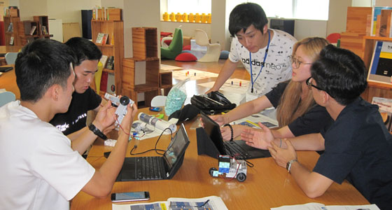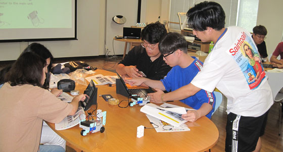 平成30年8月21日、韓国・東義大学校の日本での研修の一環として、アーテック・ロボカープログラミングを実施しました。15名の学生が参加しました。二人一組になり、ブロックでロボカーを作るところからスタートし、PCでプログラミングを行い、ロボカーを走行させました。テキストを参考にTAのアドバイスを受けながら、衝突回避自動車を作成しました。最後はライントレースの走行にもチャレンジしました。楽しい雰囲気の中、真剣に取り組む姿が見られ、3時間にわたる有意義な体験会となりました。