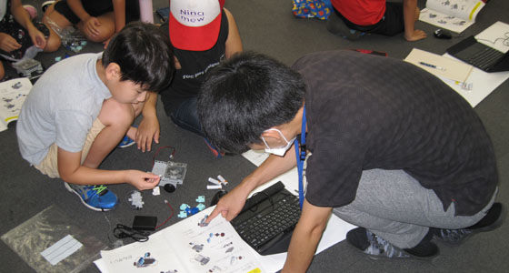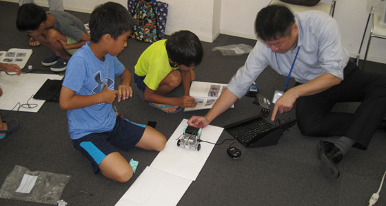 平成30年8月23日、北九州市立戸畑図書館の模擬講義がありました。小学生20名(1年生から5年生)が参加しました。中尾PBL教育推進室長より、大学の説明が行われた後、テキストに沿って、ブロックロボットの製作をしていただきました。二人一組になり、ロボカーを組み立て、PCを用いてプログラミングを行なった後、ロボカーを走行させました。TAのアドバイスを受けながら、衝突回避までのプログラム作成をしました。机から落ちないロボカー走行を楽しむ姿が見られました。90分という限られた時間でしたが、どのチームも熱心に取り組みました。夏休みの楽しい学びの場となったようです。