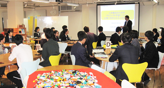 令和元年10月19日、おきなわ教育ラボ 模擬講義・交流会がプロジェクトラボラトリで行われました。沖縄県内の各高校より選抜された2年生19名が参加し、中尾PBL教育推進室長による「理系(技術系)人材養成のためのプロジェクト学習について-社会が求めるアクティブな人材とは?-」というテーマで模擬授業が行われました。冒頭で大学説明と近年社会が学生に求めている素養について解説があり、レゴⓇシリアスプレイⓇ(LSP)によるプロジェクト学習が行われました。ブロックで作った作品を通して語り、聴き、質問に答えることで内観を深め、さらにテーマを共有するワークが行われ、どのチームも熱心に取り組んでいました。その後明専寮生を交えた交流会か行われ、大学での学びや生活の様子など高校生から活発な質問があり、和やかな会となりました。